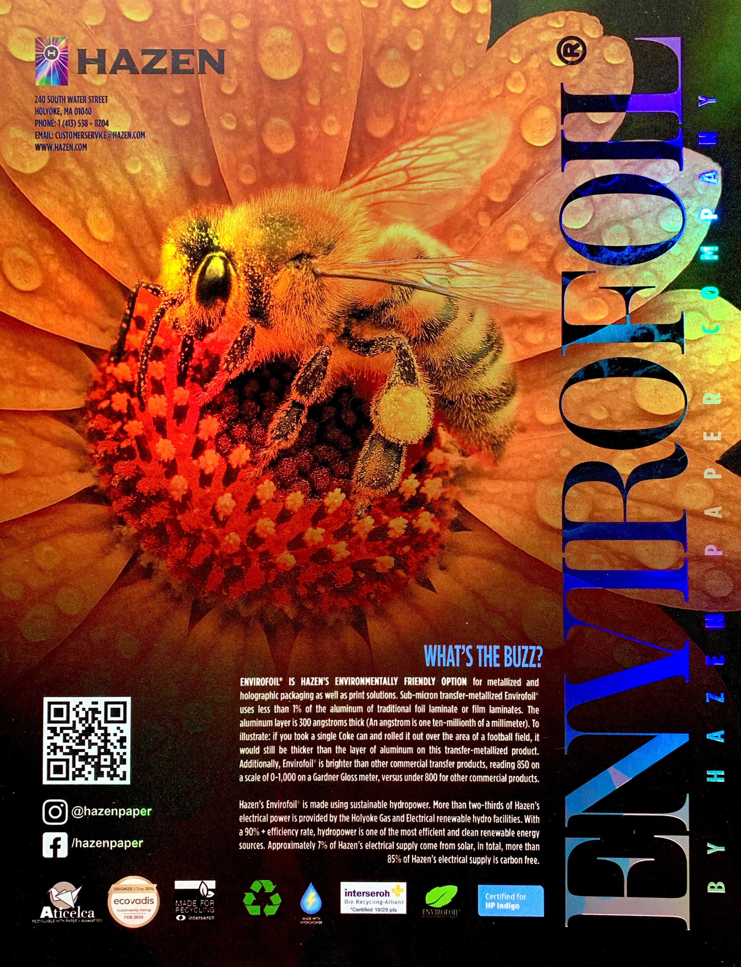 - Hazen Paper Company's advanced holographic technology creates eye-catching, reflective designs for packaging and print. Its sustainable Envirofoil® uses minimal metal and no plastic film, offering a recyclable, eco-friendly alternative to traditional foil materials.